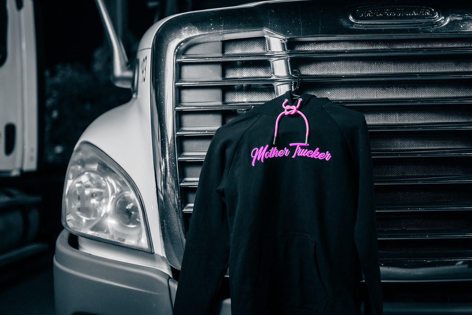 Stay warm during the cool months or while the AC is blasting in your rig with our super stretch cozy hoodie. A black hoodie with a high-quality and detailed embroidery of Mother Trucker. (Standard Fit / Fitted.)