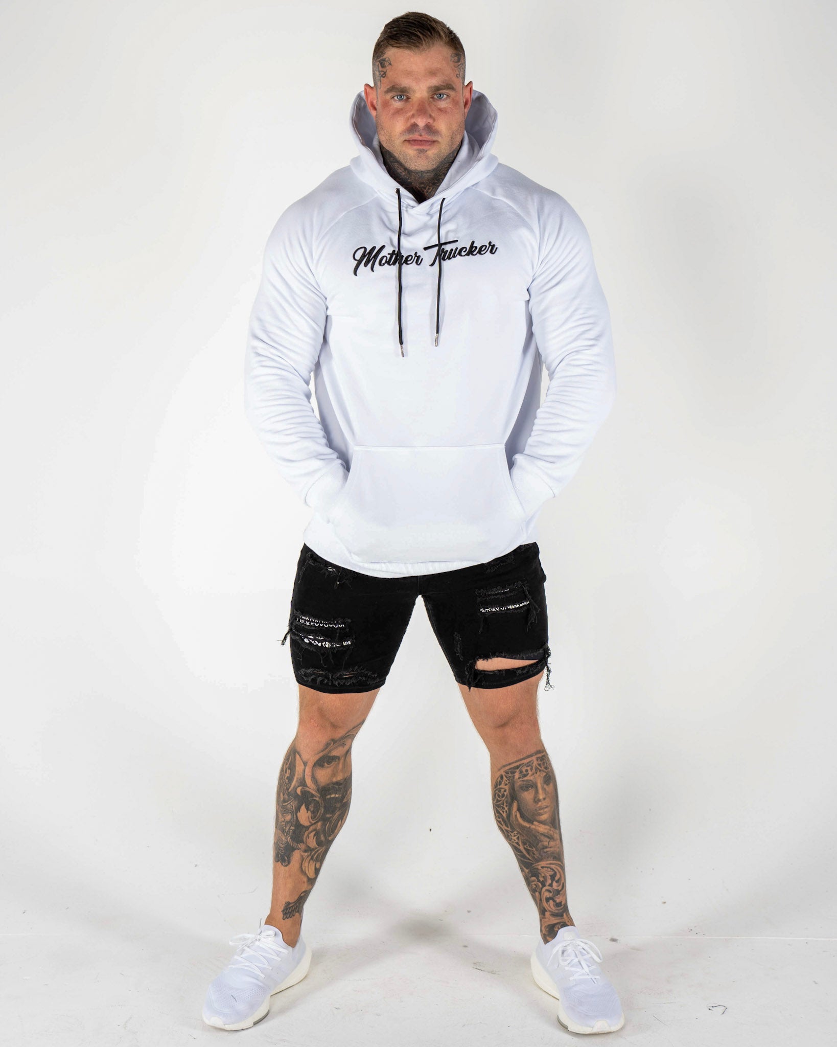 Stay warm during the cool months or while the AC is blasting in your rig with our super stretch cozy hoodie. A white hoodie with a high-quality and detailed embroidery of Mother Trucker. (Standard Fit / Fitted.)